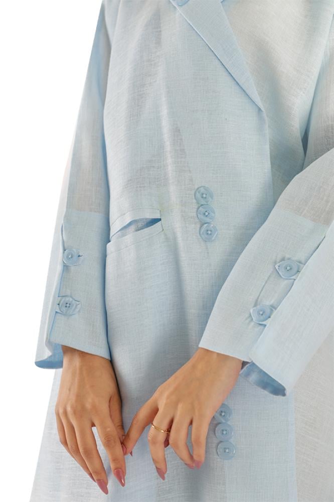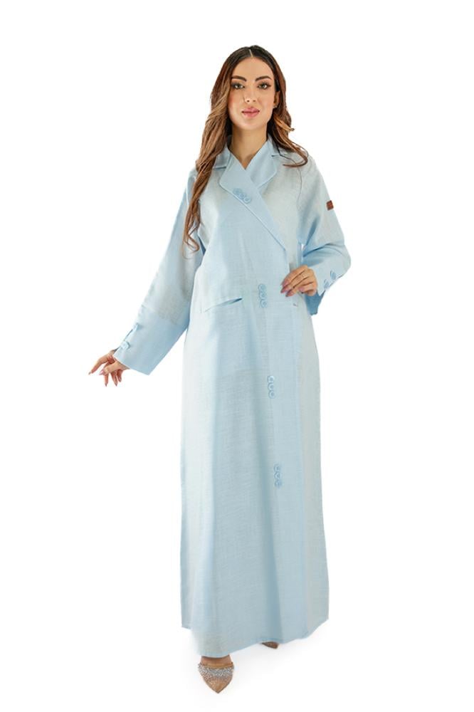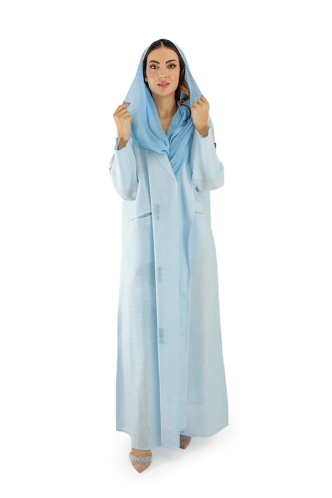 بقصّة بليزر عصرية ولون أزرق سماوي من قماش الكتان الفاخر، تطلّ عباية أوساجي كقطعة توازن بين الرقي والجرأة. التفاصيل الدقيقة في الأزرار المبتكرة تضيف لمسة غير مألوفة تخلي التصميم استثنائي بين العبايات الخليجية.