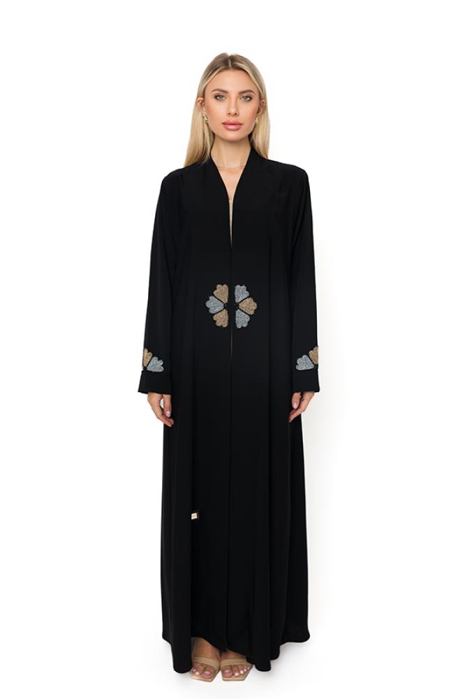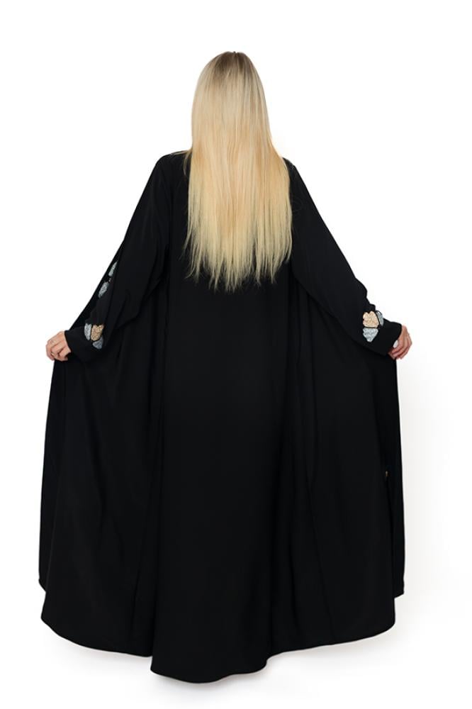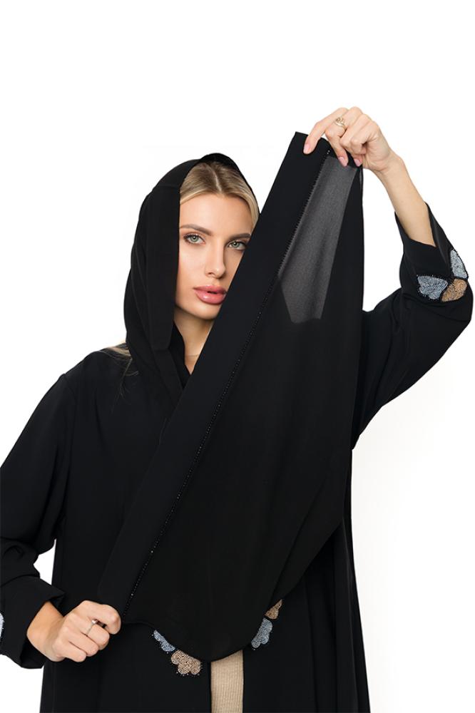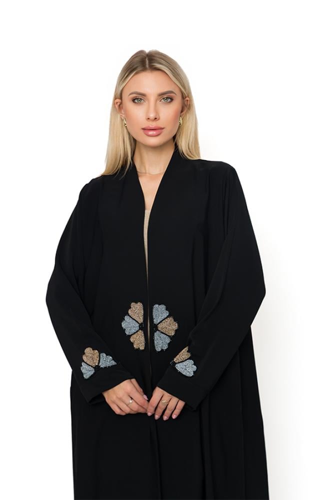 استمتعي بأناقة ما لها مثيل مع عبايات أوساجي161، المصممة بعناية من قماش كريب فاخر، خفيف وانسيابي بملمس ناعم يمنحك راحة وأناقة في نفس الوقت. اللون الأسود الكلاسيكي أضيفت له لمسات تطريز يدوي على شكل ورود متقابلة بألوان هادئة تضفي لمسة من الرقي والجاذبية على إطلالتك.
