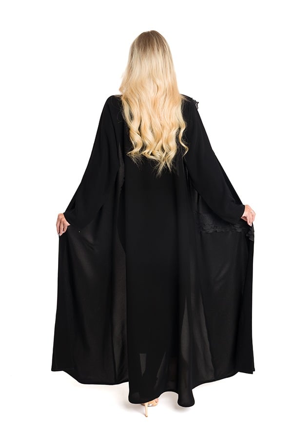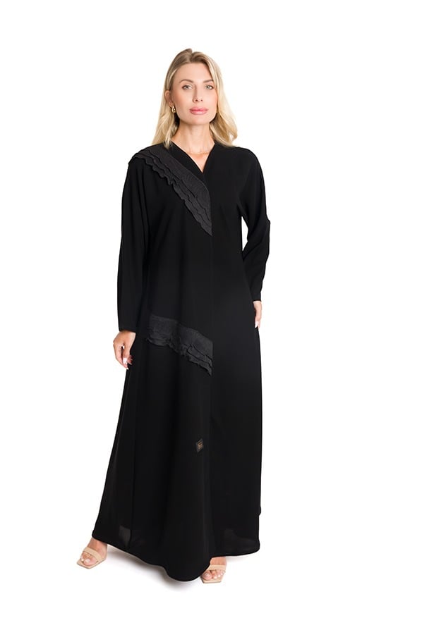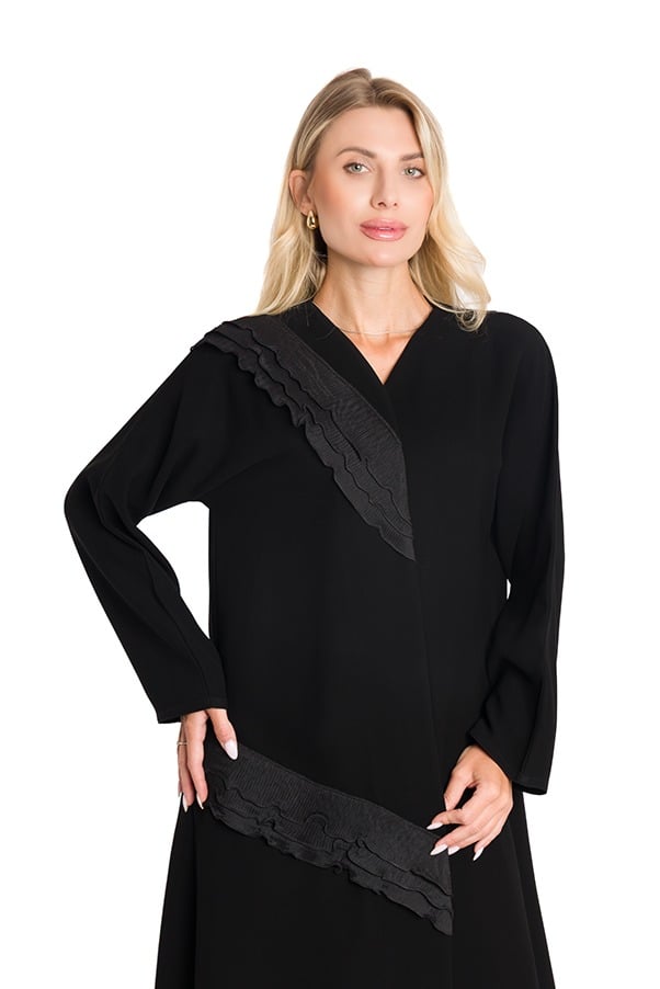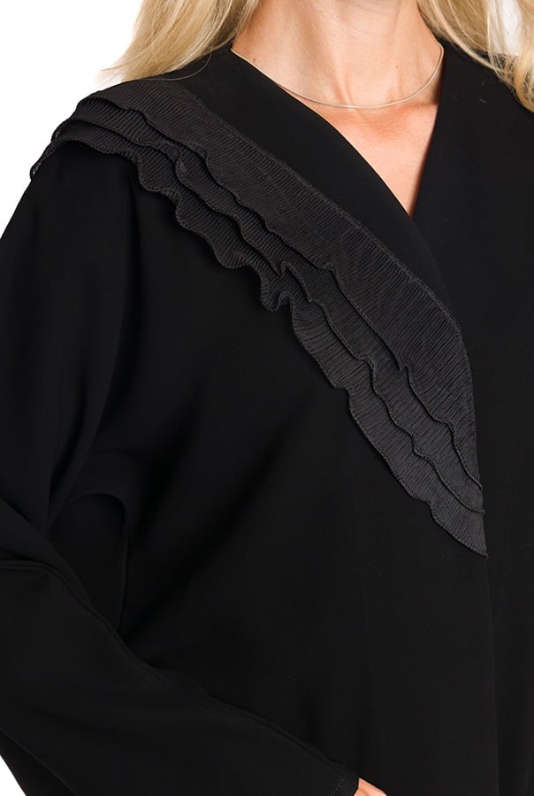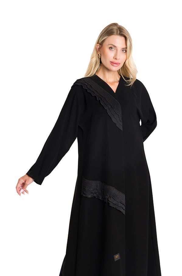 عباية سوداء مصنوعة من قماش الكريب الملكي الفاخر، تتميز بخامتها الثقيلة ولمعانها الأنيق لتمنحك إطلالة راقية وكلاسيكية ويومية