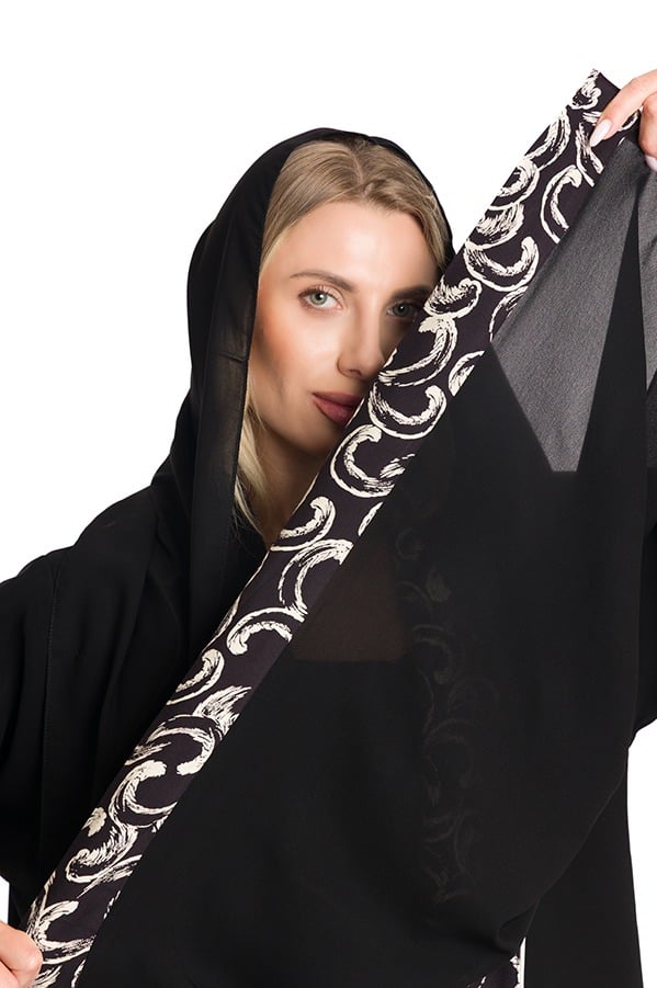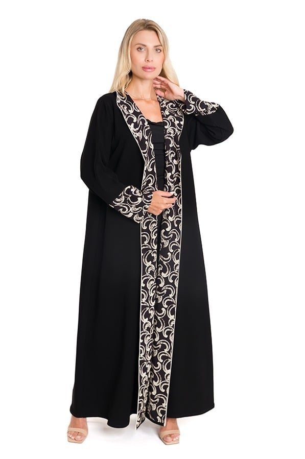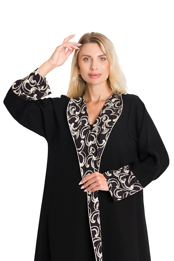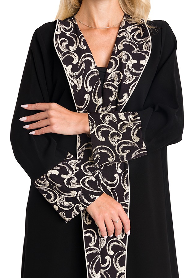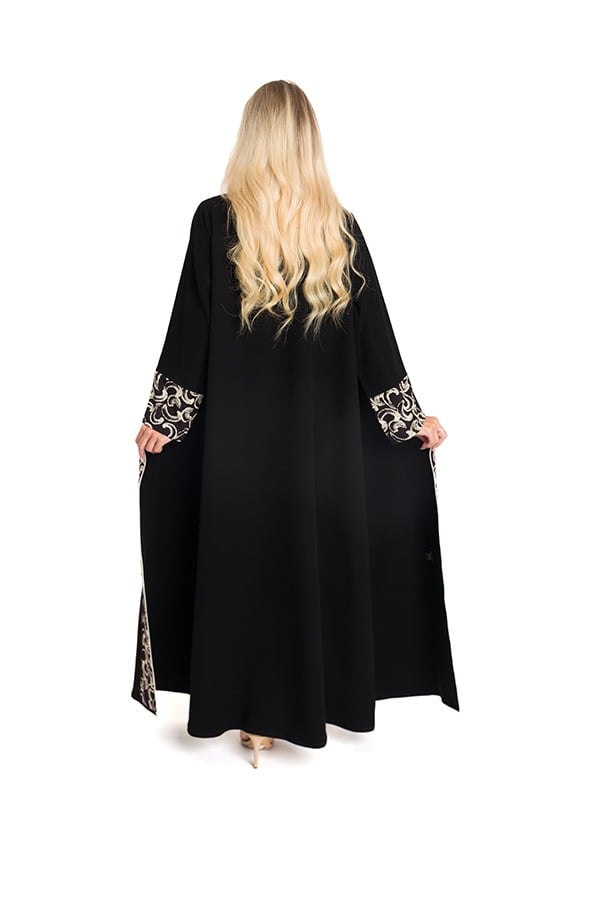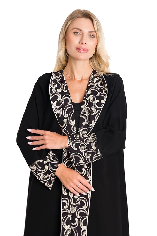 عباية مصنوعة من قماش كريب ملكي ذات انسيابية عالية تعطي العباية شكلاً مستقيمًا وأنيقًا. مع ياقة عريضة مزخرفة تمتد حتى أسفل العباية