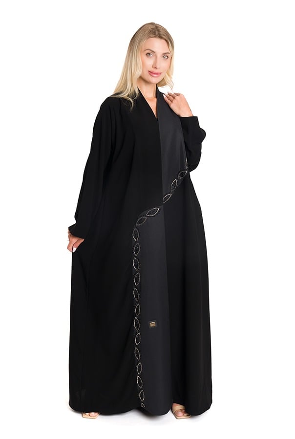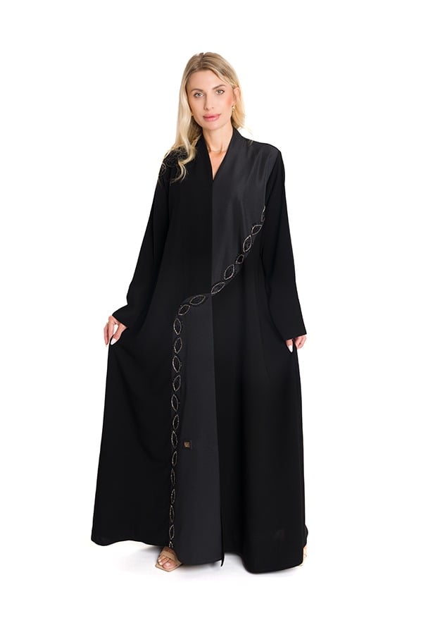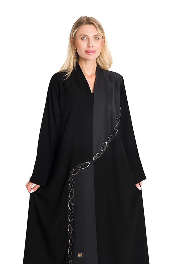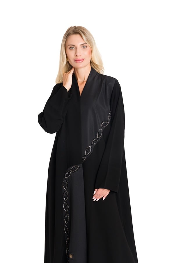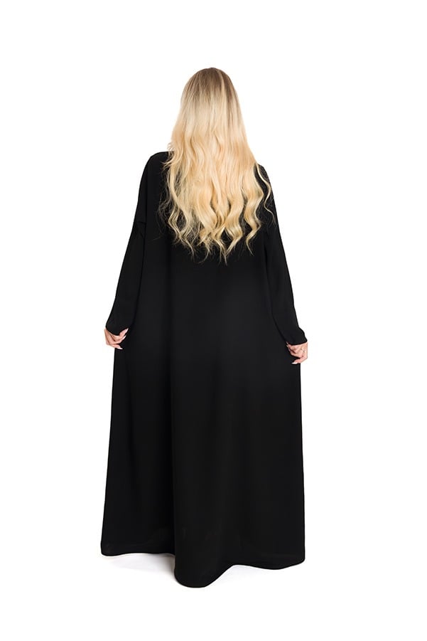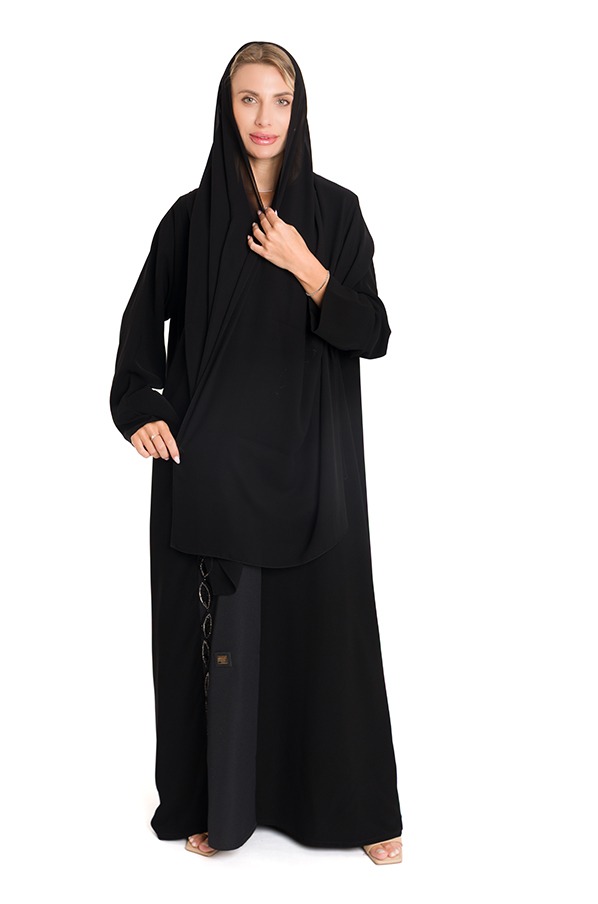 عباية من القماش الاسود فاخرة بانسيابية مثالية تمنح العباية مظهرًا راقيًا وانسيابًا ناعمًا أثناء الحركة.