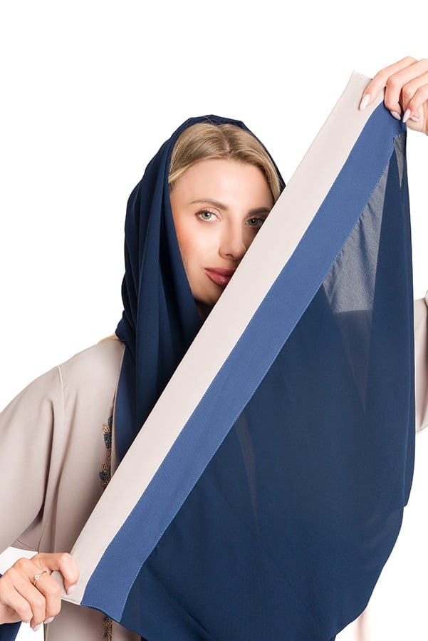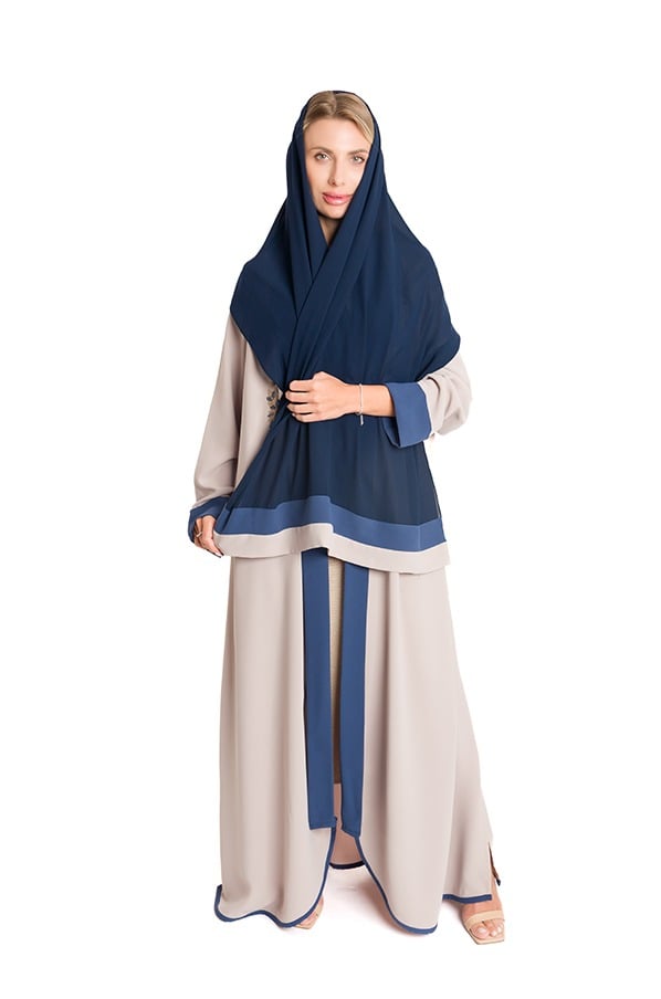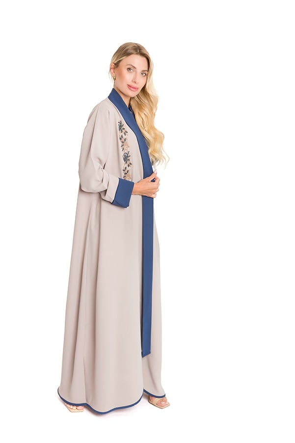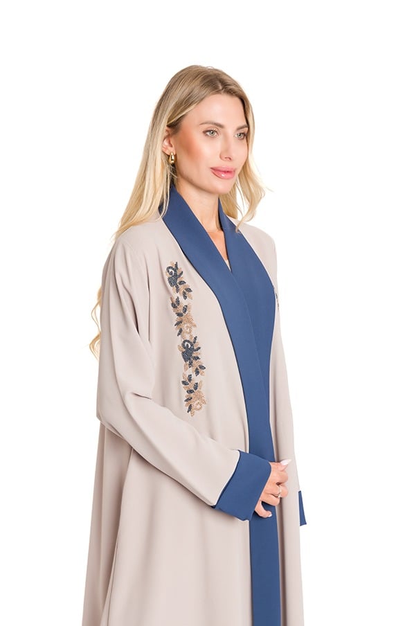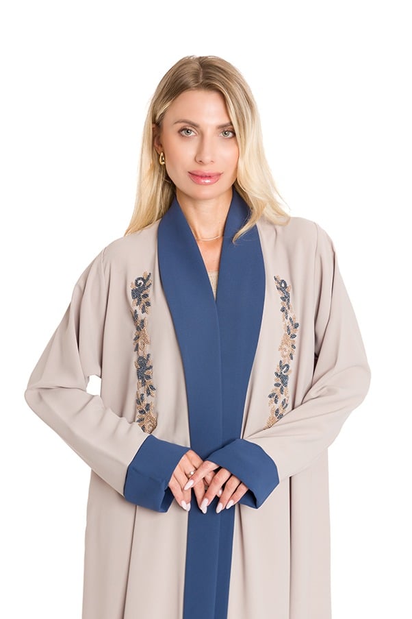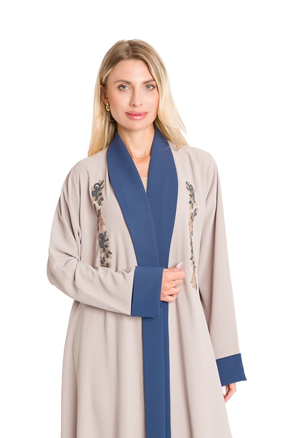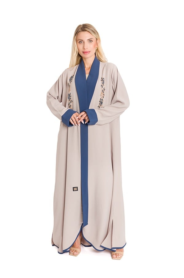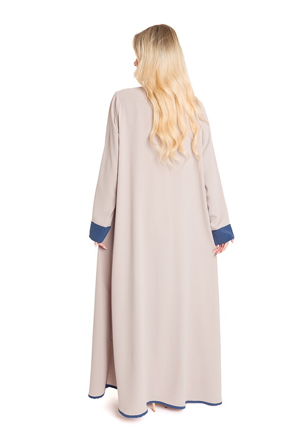 عباية مصنوعه من قماش كريب وياقة داخلية وكفّات بلون أزرق ملكي أنيق يضيف عمقًا فخمًا للتصميم