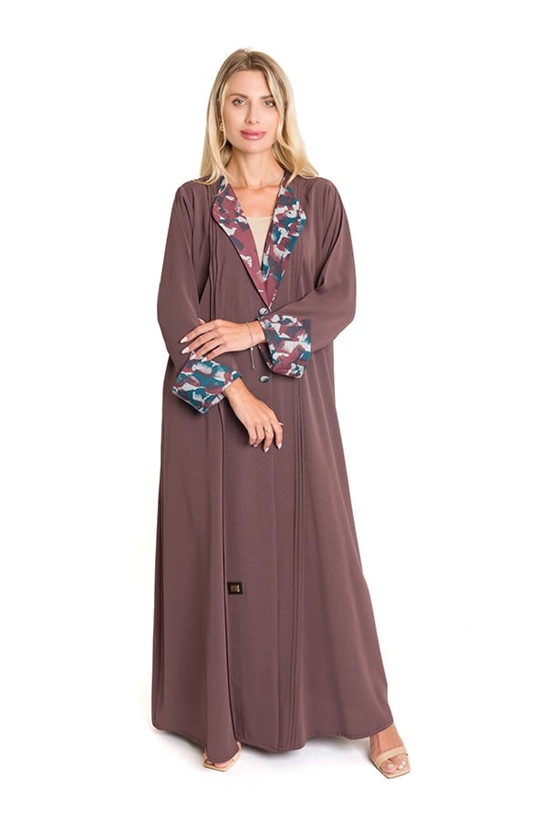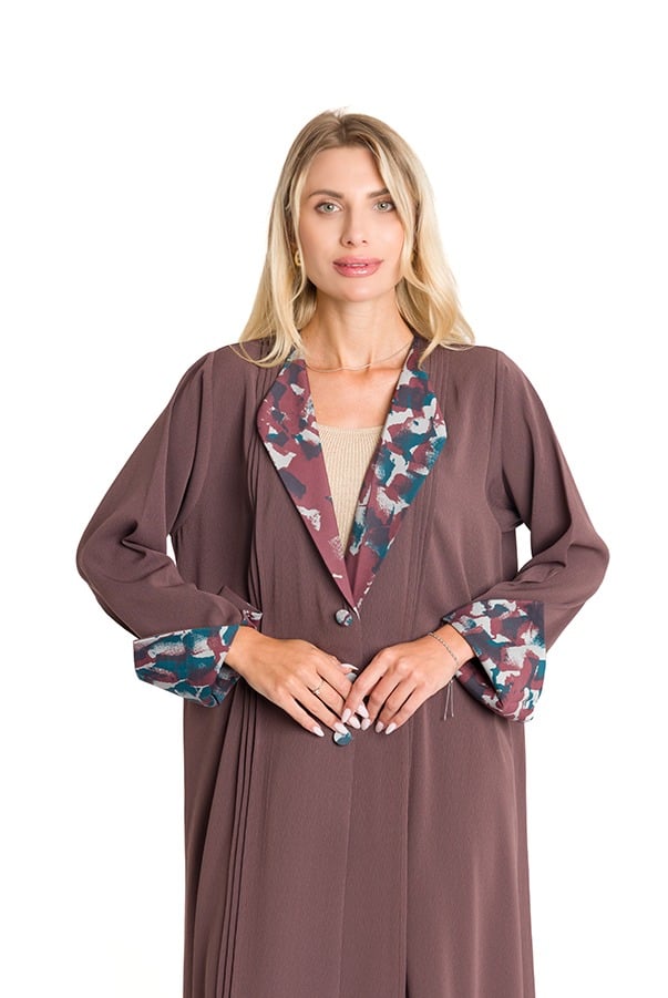 عباية بستايل بليزر باللون الموف، تتميز بتفاصيل أنيقة على القبة وقصة أكمام سبعة، مع تدخيلات قماشية داخلية تضيف لمسة فخامة عصرية لإطلالتك.