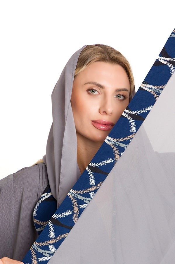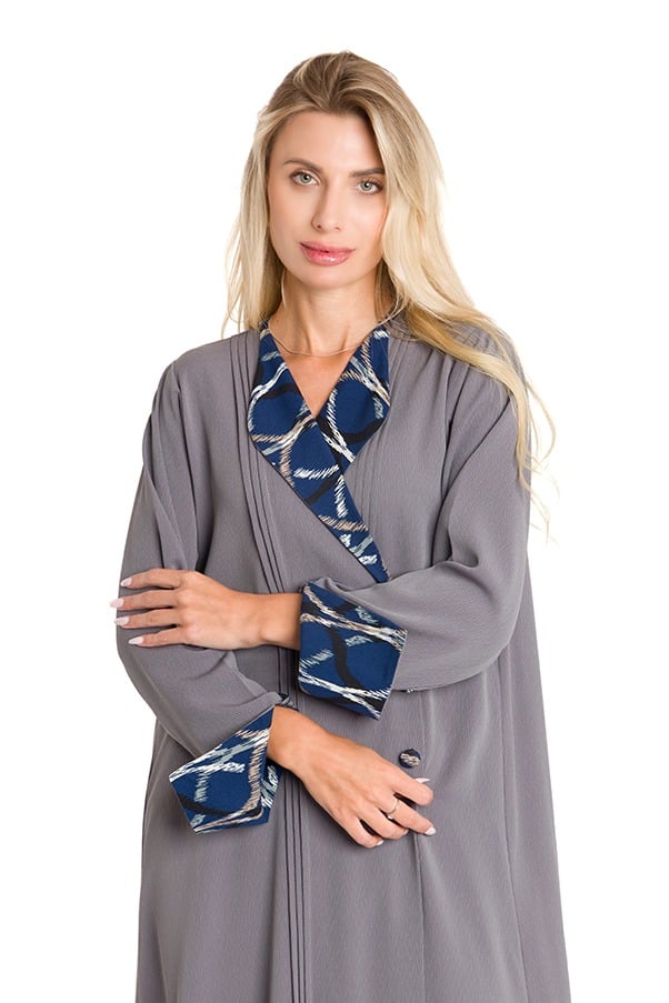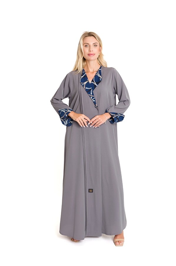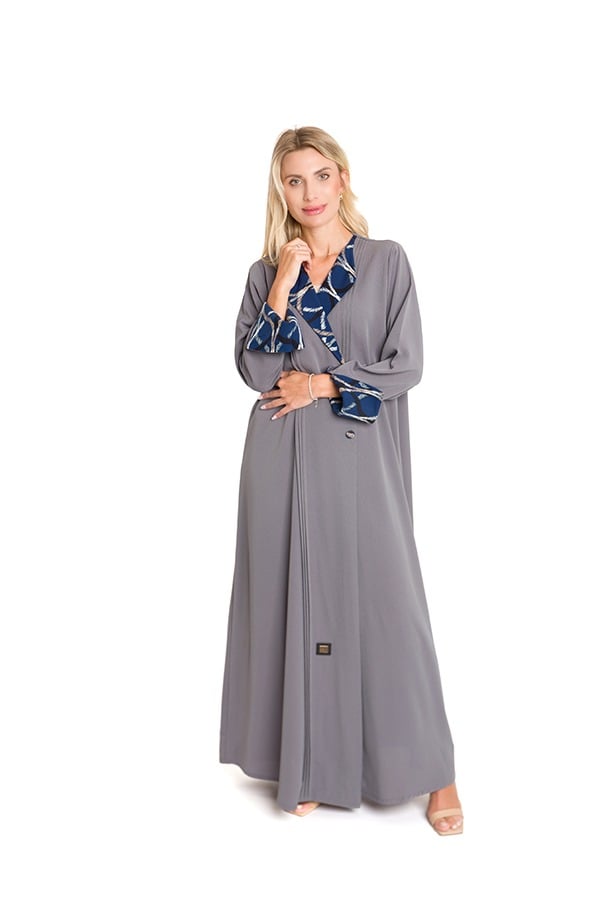عباية بستايل بليزر باللون رمادي، تتميز بتفاصيل أنيقة على القبة وقصة أكمام سبعة، مع تدخيلات قماشية داخلية تضيف لمسة فخامة عصرية لإطلالتك.