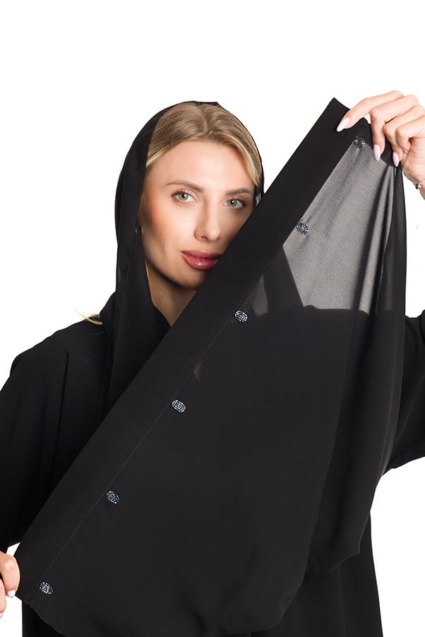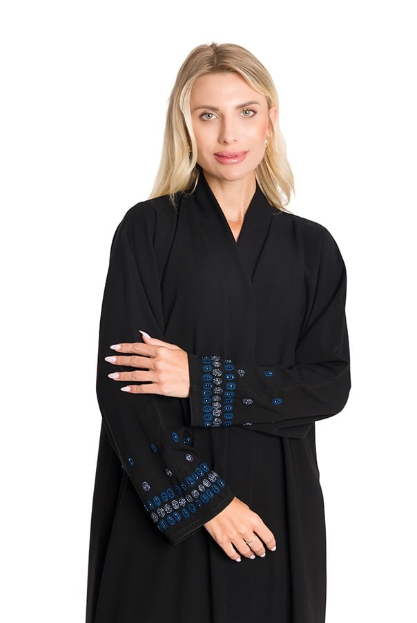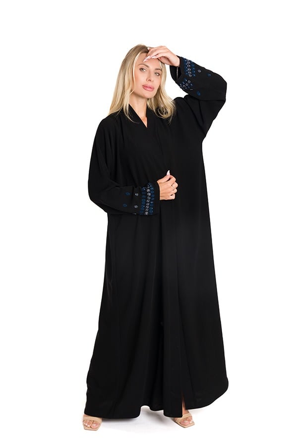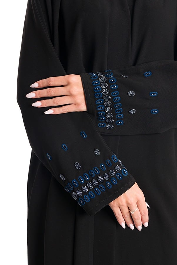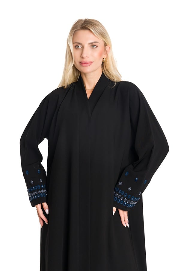 عباية فاخرة مصنوعة من قماش الكريب الملكي بلمعته الأنيقة وخامته الثقيلة، مزدانة بتطريز رائع على شكل ورود بخيوط وخرز متقنة على الاكمام لتضفي لمسة فخامة راقية. تصميم كلاسيكي أنثوي يمنحك حضوراً مميزاً وإطلالة تعكس الذوق الرفيع.