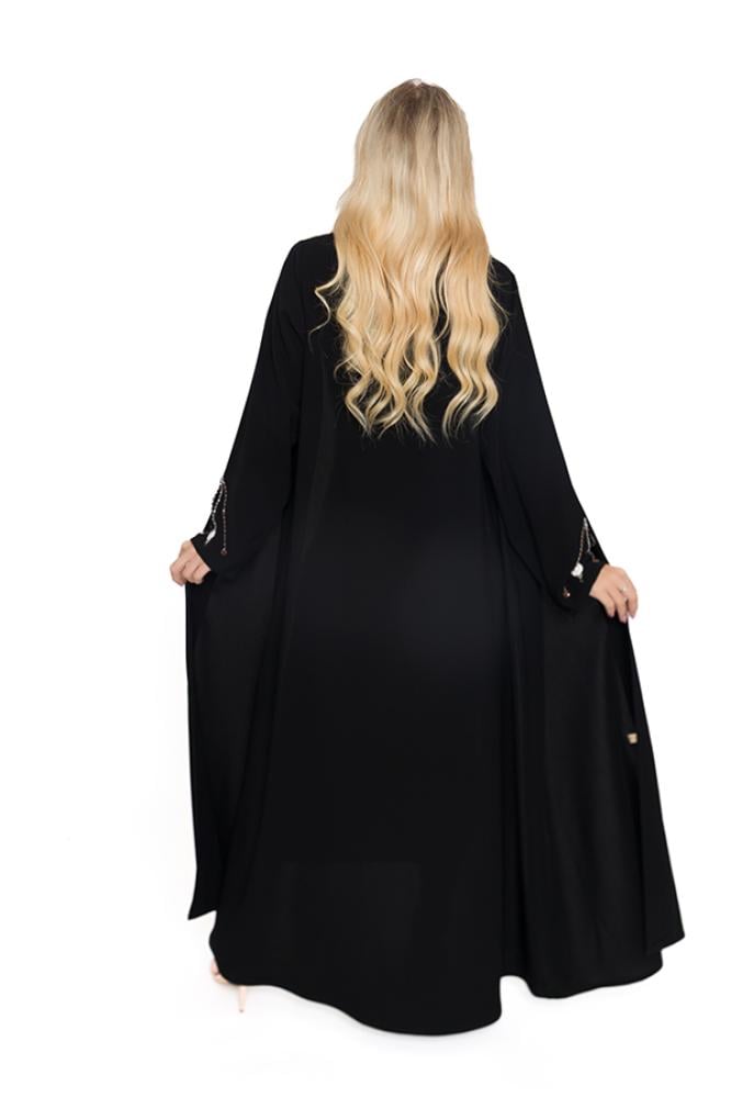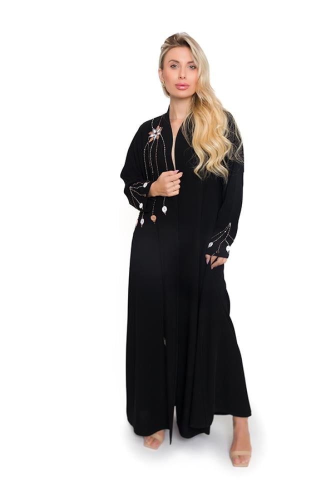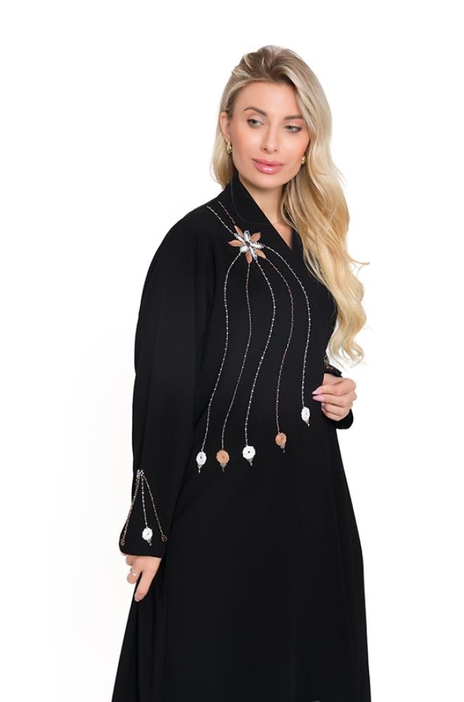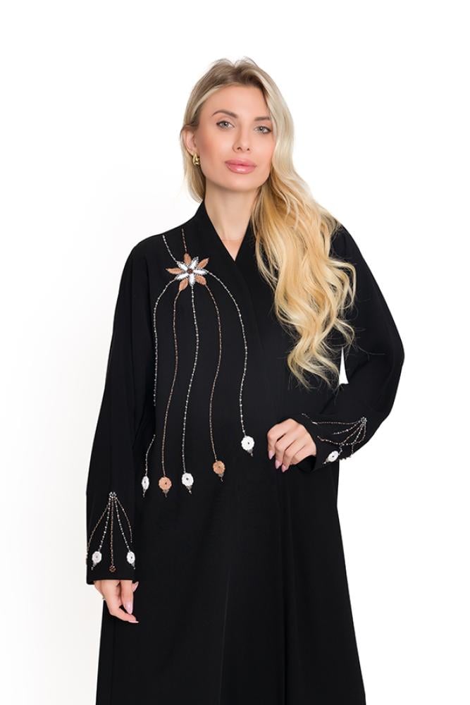 الأناقة ما تحتاج كلام… عبايات أوساجي 190 تجي لتكون القطعة اللي تخطف الأنظار في كل مناسبة. مصنوعة من قماش كريب أسود فاخر، يزدان الصدر والأكمام بتطريز يدوي متقن، تتوسطه زهرة بارزة بألوان هادئة تتدلى منها خطوط مطرزة مرصعة بلمسات لؤلؤية صغيرة باللونين الأبيض والبرتقالي. تفاصيلها تنطق بالفخامة وتمنحك لمسة أنثوية راقية لا تقاوم.
