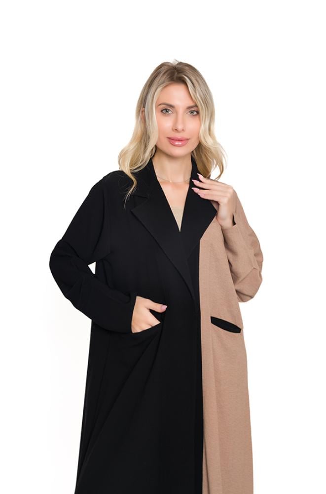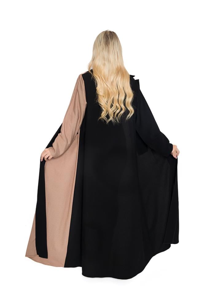 عباية عصرية من قماش كريب عملي بتصميم ثنائي اللون مميز يجمع بين الأسود والبيج، مع ياقة كلاسيكية وجيوب جانبية بتفاصيل سوداء أنيقة. الدمج بين اللونين يعطي تباين راقي ولمسة حديثة، مما يجعلها مثالية للإطلالات العملية والكاجوال الأنيقة